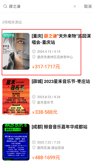 3、如图,可看到薛之谦相关的演出,选择需要观看的演出即可,这里以【重庆站】为例。