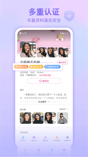 世纪佳缘是中国较早要求会员提交身份证明资料,用五星级去评定会员信用的婚恋网站,每个会员的征友资料页面都会标注该会员是否上传了证件,上传了哪些证件,直接体现了会员资料的真实程度。