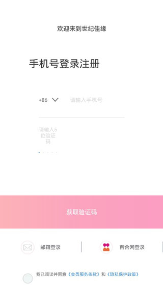 2、进入app后,填写你的手机号进行注册等信息,也可以用邮箱、百合网账号登录,登录前需要勾选下方“我已阅读并同意”协议。