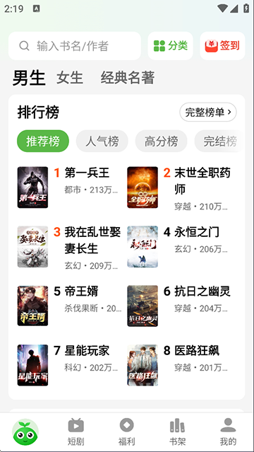 绿豆免费小说纯净版还内置了阅读排行榜,包括推荐榜、人气榜、高分榜、完结榜、搜索榜和新书榜等,这些榜单为你提供了阅读的参考,避免你陷入书荒。而且每本小说都有评分显示,让你轻松阅读高分精品作品