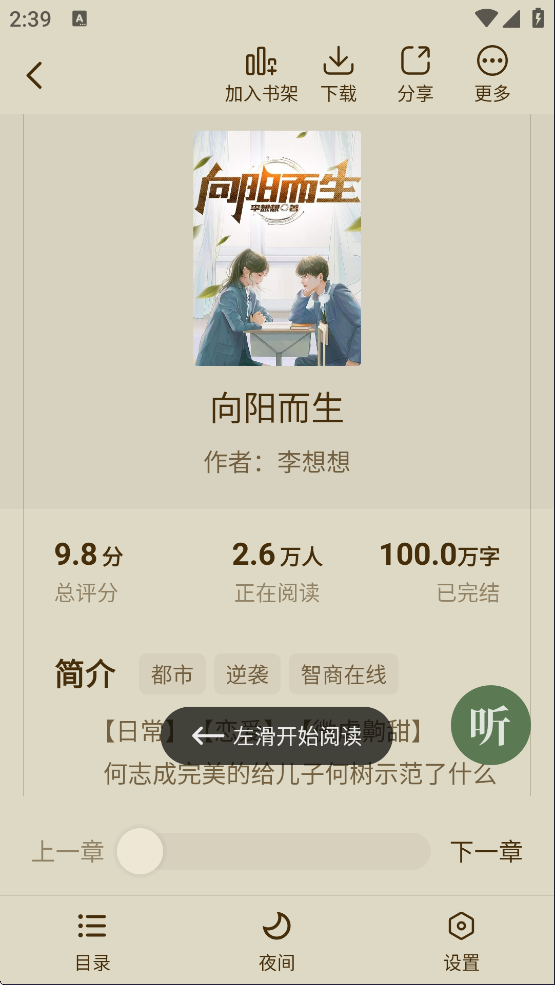 软件支持看书和听书两种模式,你可以根据自己的喜好选择使用方式。听书支持定时关闭和语速调节功能,看书则支持夜间模式和缓存下载等,非常适合喜欢小说的朋友使用