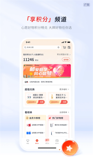 以本地特色为主,整合信用卡特惠商户及活动,强调生活场景,包括加油、电影、外卖、缴费、充值、洗车、生鲜、运动、出行等功能,以及积分享兑、生活服务等楼层。
