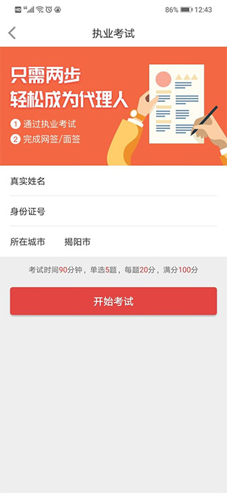 4、进入代理人考试界面,点击“开始考试”(个别人员需要点击三次才能进入),如点击之后弹出已有执业证,需注销后才能注册的提醒,则说明注册人员的身份证在其他保险公司有注册过,需原单位注销执业证后才能在V盟上注册代理人。