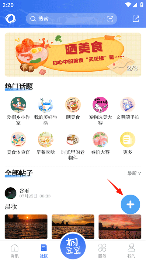 2、在社区页还有各种热门话题等你来观看讨论,点击右下角的添加按钮;