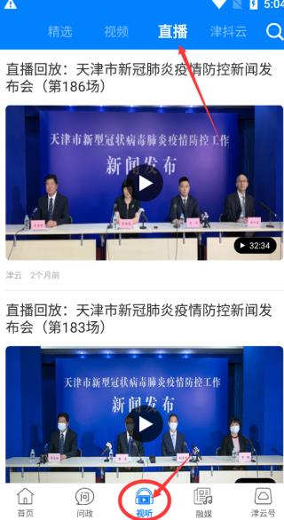 点击功能栏里面的“视听”,选择上方“直播”便有各场防疫新闻的回放在线观看了!