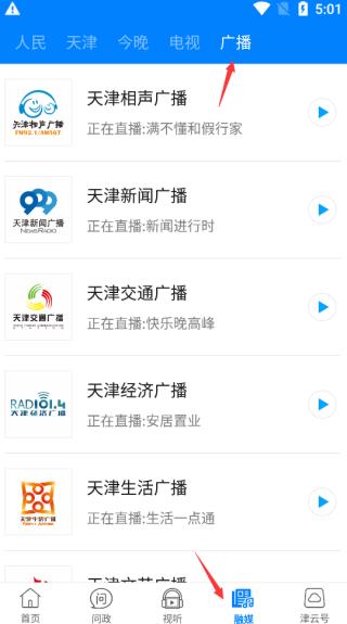 点击功能栏里面的“融媒”,选择上方“广播”便能随意听你想要了解的资讯了。