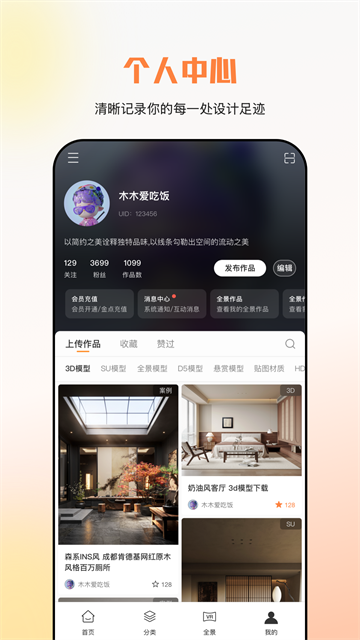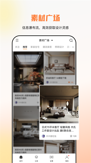 v1.6.6建E网app是由南京设易网络科技有限公司开发的一款集“网站+新媒体+社群”三位一体的室内设计内容综合服务软件,拥有100000+原创模型、贴图、施工图、装修案例等室内设计行业素材,为设计师提供VR全景合成工具、云渲染工具、在线教育、行业资讯等服务,是室内设计师必不可少的实用工具。并且建E网app也可以与pc平台同步使用,方便用户在手机上浏览或收藏网站的素材、在线观看视频,实时接收网站消息,及时了解作品上传、下载、审核动态,同时更方便的完成签到任务。