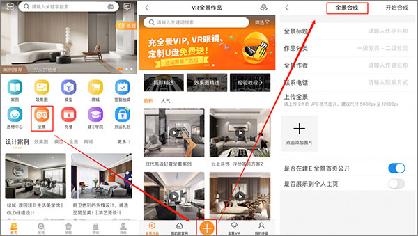 打开建E网APP——点击全景——点击添加,进入全景合成页面,填写相应信息,就可以开始合成全景作品啦~