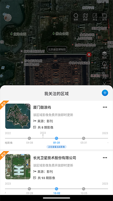 用户可将感兴趣的区域加入关注清单,随时解锁多期历史影像,同时订阅功能支持获取最新卫星影像,确保第一时间掌握动态。