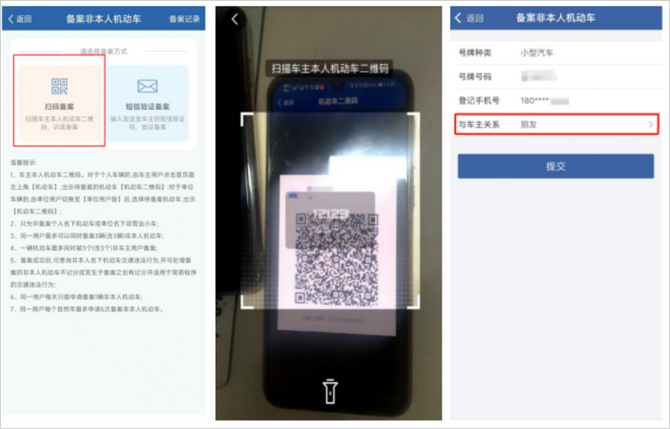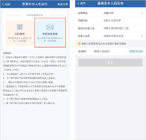 采用“短信验证备案”方式的,用户输入需要备案的非本人机动车的号牌种类、号牌号码、发动机号后六位,选择与车主关系后,点击获取验证码,系统将发送短信验证码至车主手机号码(验证码优先发送至车主12123注册的手机号码,未注册12123账户的则发送至机动车登记手机号码),申请用户输入车主收到的短信验证码,验证通过后,提交备案申请。
