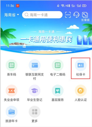 1、进入海南一卡通软件主页面-社保卡-“社会保障卡”;