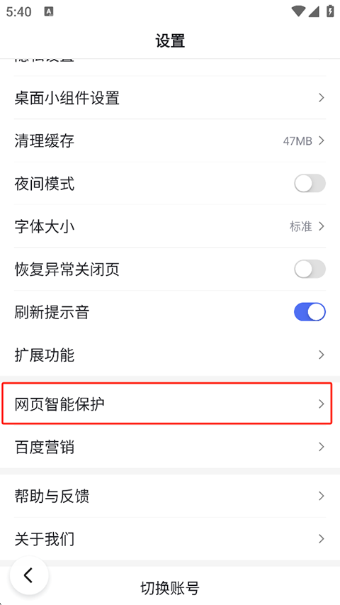 在“我的”页面,点击右上角的三横小齿轮图标或“更多”图标;或者直接点击页面中的“设置”选项。 找到“网页智能保护”。