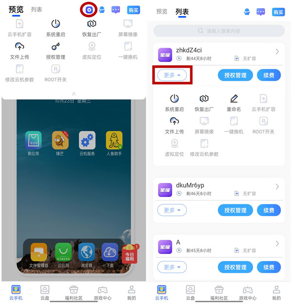 ②进入双子星APP,点击上方【列表】按钮,进入云手机列表,选择故障的云手机点击【更多】,弹出设置栏,点击【重启】或【恢复出厂】按钮,云手机将进行重启或恢复出厂设置,请稍等30秒后再进入“云手机”。