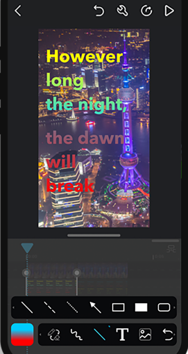 - 支持添加6种媒体到你的影片中。[视频(可选择从相册或者相机)、照片(可选择从相册或者相机)、自画、文字、音乐、录音]