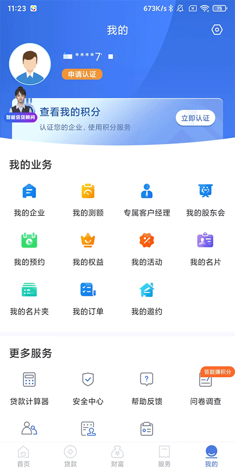5、我的:包含企业、测额、专属客户经理、预约、权益、名片等个人业务服务入口。