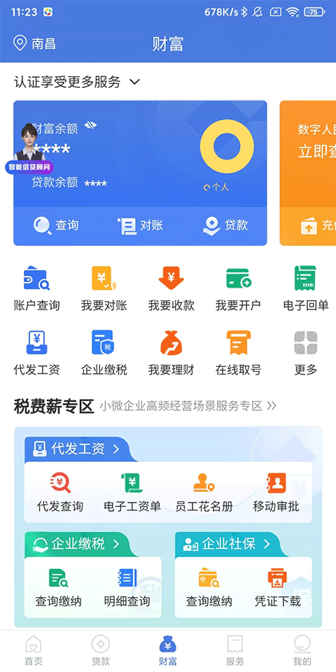 3、财富:税费专区,企业代发工资、企业缴税,企业社保,多种需求服务,在此一键办理;