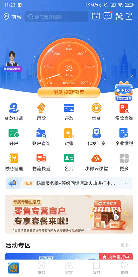 1、 首页:提供贷款申请、还款、续贷、开户、账户查询、对账、代发工资、企业缴税等全方位金融服务;