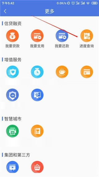 4、贷款申请成功后,在应用程序首页的更多功能菜单中找到进度查询,查看自己申请的进度。