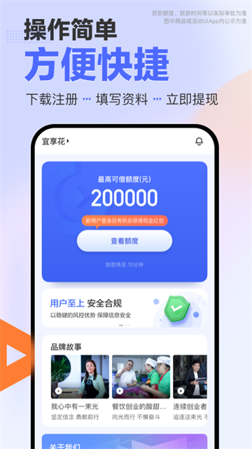 宜享花app是一款高额度、低息费、无抵押的信用贷款软件,通过融合运用人工智能、云计算等前沿科技,建立了灵活高效的信用评估及管理体系,实现了实时计算、秒级响应的全自动化审批,从注册、申请到提款的全程,用户均可在线上完成,是一个非常可靠的在线贷款平台,借款操作方便快捷,只需一键登记身份信息就能贷到款,贷款速度快,快速到达账户。而且这款平台的使用门槛很低,最重要的是利率低,无抵押,最高的贷款额度高达20万,循环金额更灵活,只需要简单三步就可以申请,实力雄厚无需任何担心,还有专业团队为你保驾护航,不断提升你的信用额度能贷到更多哦。支持12期分期还款,让你还款时毫无压力!