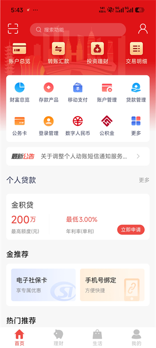 聚合了账户总览、转账汇款、投资理财等多项金融服务功能入口,还有个人贷款产品推荐及最新公告等信息。