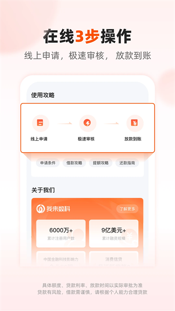 我来数科App借款门槛相对较低,用户信用良好即可享受高效服务,额度最高可达20万元,审核流程最快3分钟完成,资金即时到账。无论何时何地,我来数科都能为您提供便捷、可信赖的普惠金融支持。2014年上线以来,我来数科App一直专注于纯线上运营,为超6000万用户提供方便、快捷、可靠的金融服务。