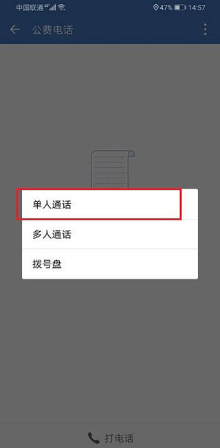 2、下面我们来使用一下公费电话,打开企业微信,点击公费电话,选择打电话,如下图所示: