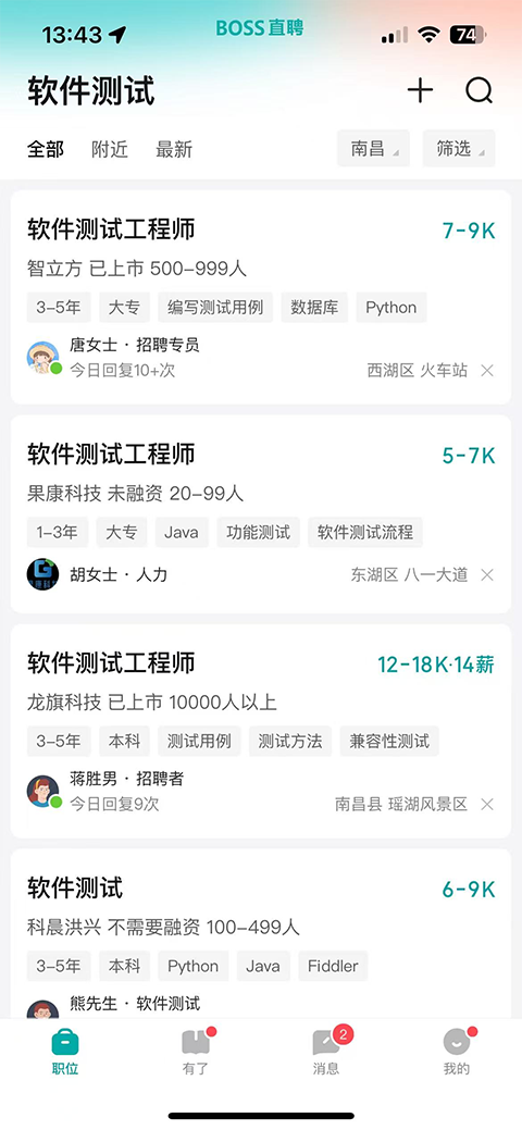 BOSS直聘App提供海量全职/兼职/实习等优质岗位,覆盖互联网/金融/文化传媒/餐饮/房地产等各类行业。开启人才网络招聘求职找工作新时代,找工作,上BOSS直聘,直接谈!