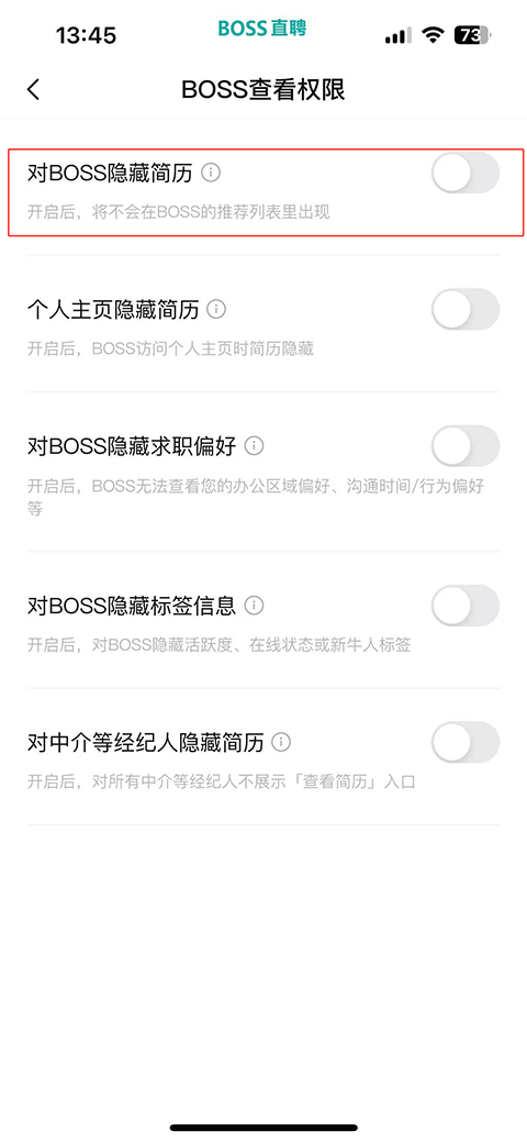 在BOSS查看权限页面中,找到【个人主页隐藏简历】或【对BOSS隐藏简历】的开关,将其打开即可完成隐藏简历的操作。