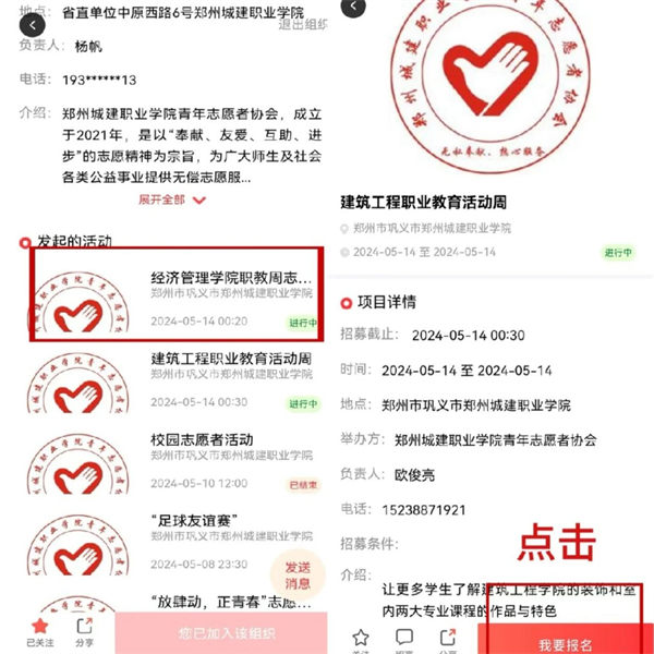 在组织页面下找到绿色图标“进行中",点击"我要报名",审核通过后会显示【您已报名】。