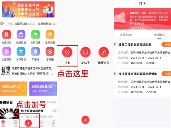 志愿河南APP的打卡功能允许大学生在开始志愿服务时进行打卡签到,以确保他们的参与被准确记录。这有助于维持活动的组织性和秩序,同时确保志愿者的服务时长得到公正计算。活动结束后,需要进行签退。