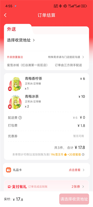 1、打开软件在首页可以看到有雪王外送和到店自取【这边以雪王外送为例】