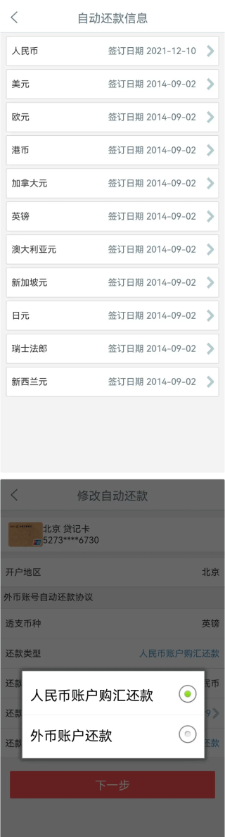 2、对于多币种信用卡,需对每个币种单独设置自动还款协议,还款类型包括“人民币账户购汇还款”和“外币账户还款”两种,其中人民币账户购汇还款即绑定您名下人民币账户作为还款转出账户,将人民币余额按照还款时汇率自动换汇并还款,外币账户还款即直接绑定您名下外币账户,使用外币余额进行扣款。