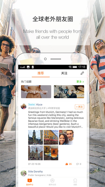 聚集千万英语爱好者,互帮互助,助你提升口语能力!在这里,你可以认识兴趣相投的小伙伴,语音私信,对话交流,共同学习,共同进步!