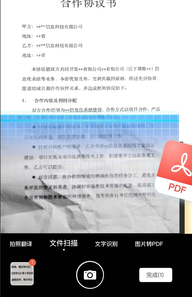 合同或纸质稿一秒转PDF文件