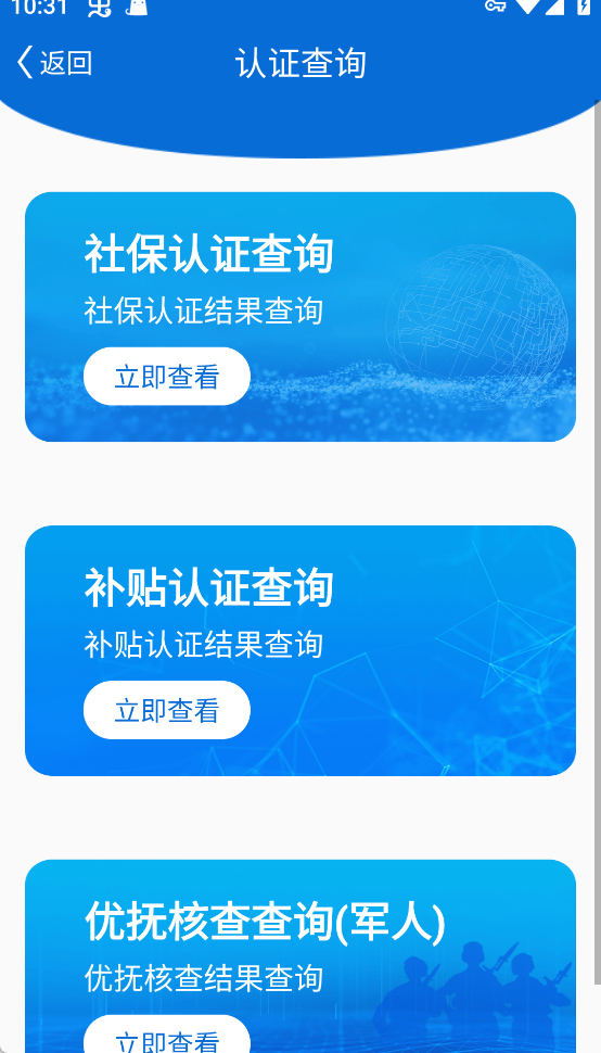 3、进入“认证查询”页面后,选择“社保认证查询”,点击“立即查看”,即可查询当前社保认证结果。