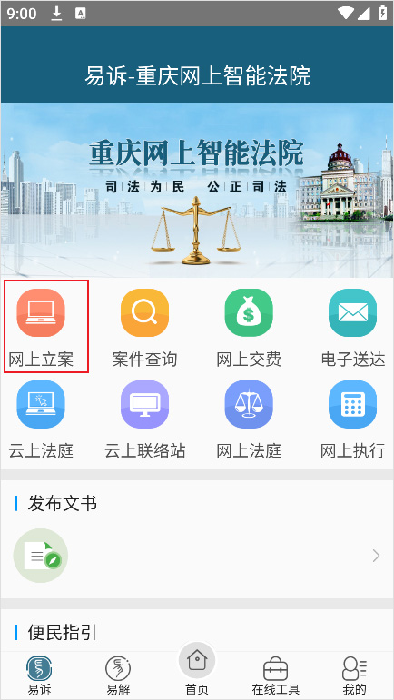 进入“重庆易法院”APP,进入“易诉”,选择网上立案,正确选择自己的相关信息即可;