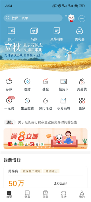 提供账户、转账、交易明细、借款等常用金融服务入口
