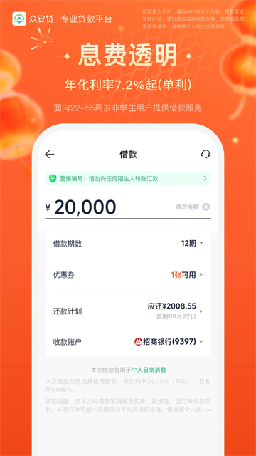 众安贷是无抵押,纯线上消费信贷平台,专注为个人和小微企业主提供即时到账的贷款服务。基于成熟专业的风控能力对客户信用进行整体评估,3步借款上限高达20万,平均5秒以内放款。众安贷app最新版功能特色
