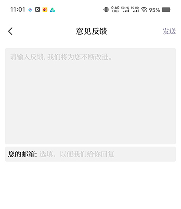 3、进入意见反馈界面,输入反馈内容描述、您的邮箱,点击【发送】。