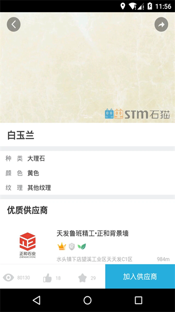 5、当你选中你想要的石材时,可以了解石材的种类、颜色、纹理以及产地,并为你推荐优质的供应商;