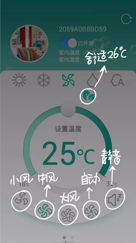 界面下方支持4种风速调节:小风、中风、大风、自动,点击对应风速图标切换;