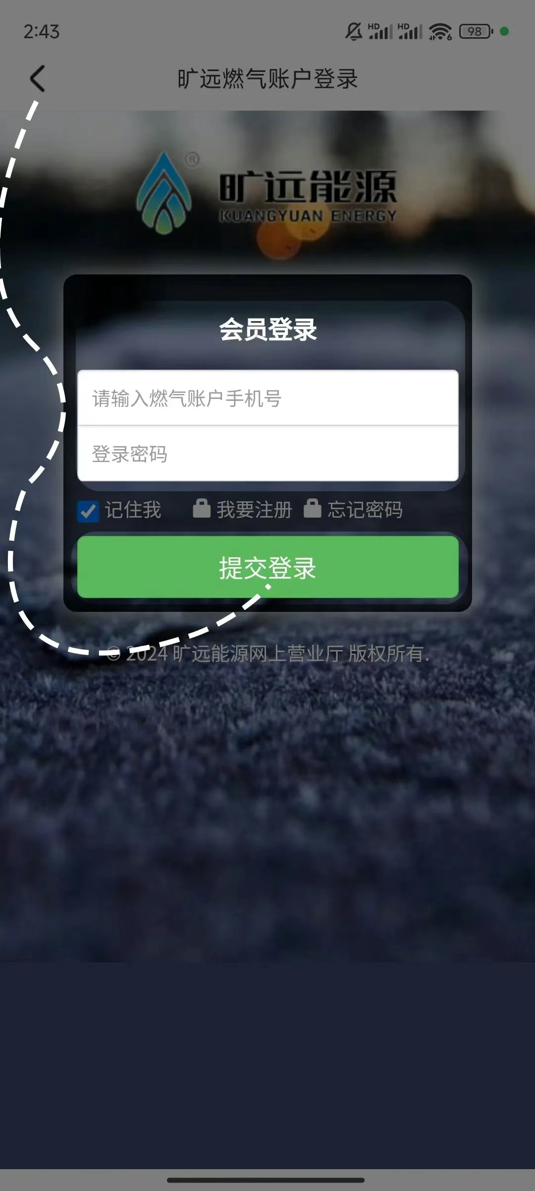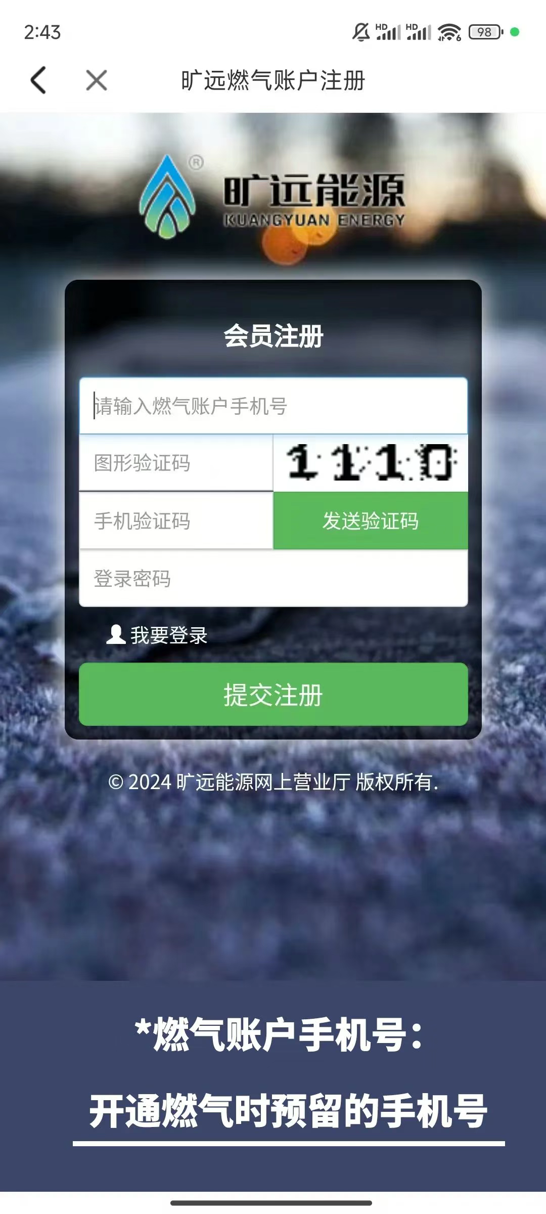 2、若您是第一次进行线上燃气缴费,则需进行账户注册,选择【我要注册】,进行会员注册,注册完成后再进行登录。注:燃气账户手机号为您开通燃气时预留的手机号,若您忘记账户信息,可拨打旷远能源24小时服务热线968188,转人工服务为您查询。
