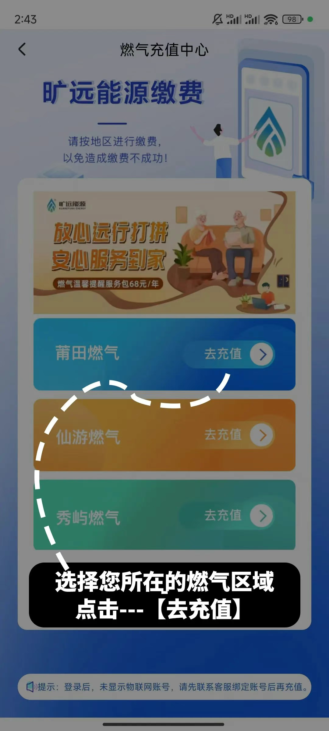 1、打开旷远生活APP,点击首页【燃气业务】,选择【燃气充值】,点击【去充值】
