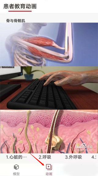 第二步,进入主界面的模型区域后,人体解剖3D是基于人卫人体解剖学教材设计了系统解剖、局部解剖、肌肉动作等几个板块,根据自己的需求选择相应的板块。