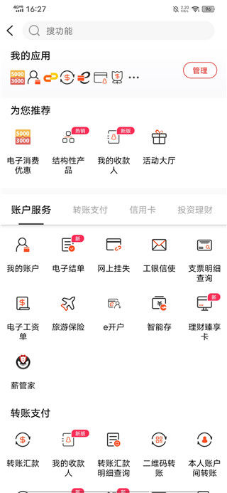 首页全面改版,头部新增我的账户、我的明细、我的外汇、我的支付四大金刚区功能。以多楼层结构展现内容,您可通过楼层内链接快速办理业务,还可以按您的日常操作习惯进行排序。