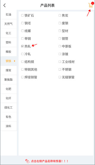 3、里面有很多各行各业的数据内容,点击钢铁那一类,选择要查询的数据,然后点击右上角的购物车图标