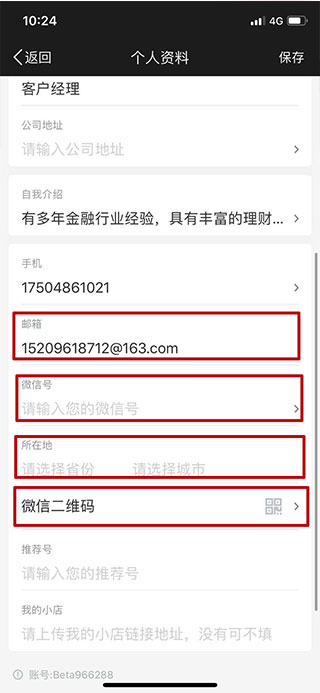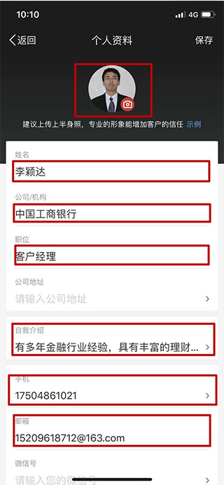 第四步:点击上面的头像框设置头像,这个头像将是个人名片的头像,随后输入下面各类信息,姓名、单位、职位、自我介绍、联系方式等信息,方便客户及时联系我们。