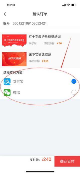 6、选择“支付宝”或“微信”支付,然后点击“确认支付”,完成课程支付