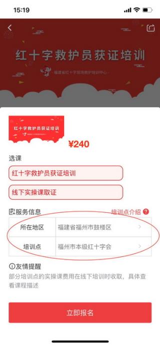3、选择线下培训“所在地”——“福州市鼓楼区”,培训点选择“福州市本级红十字会”