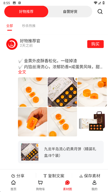 4、在素材圈可查看好物推荐,还能复制文案、保存素材助力分享种草。